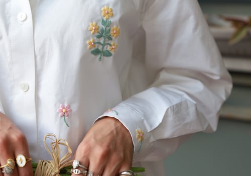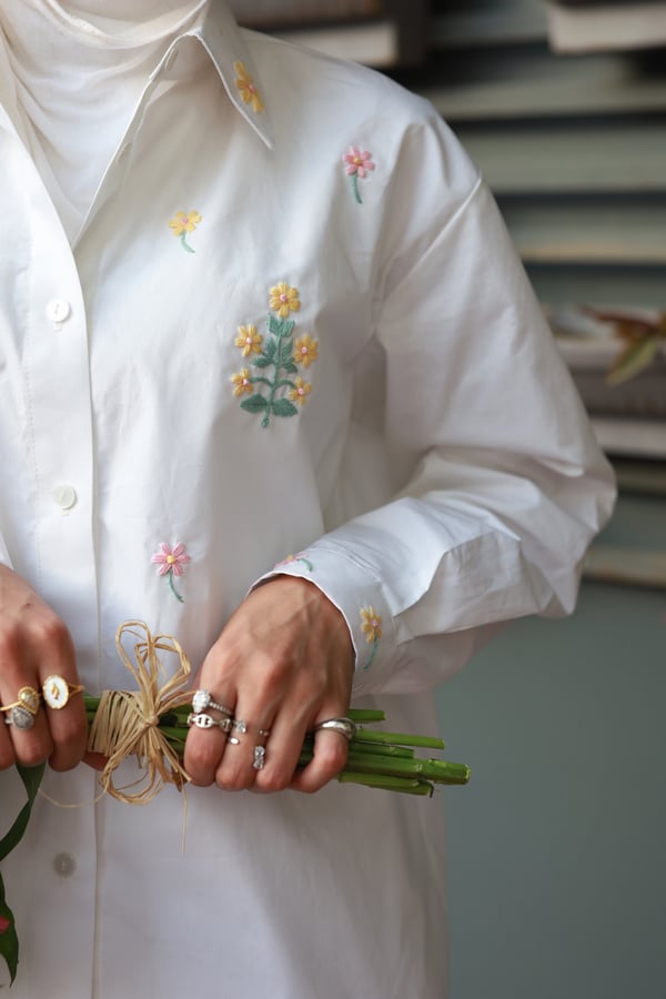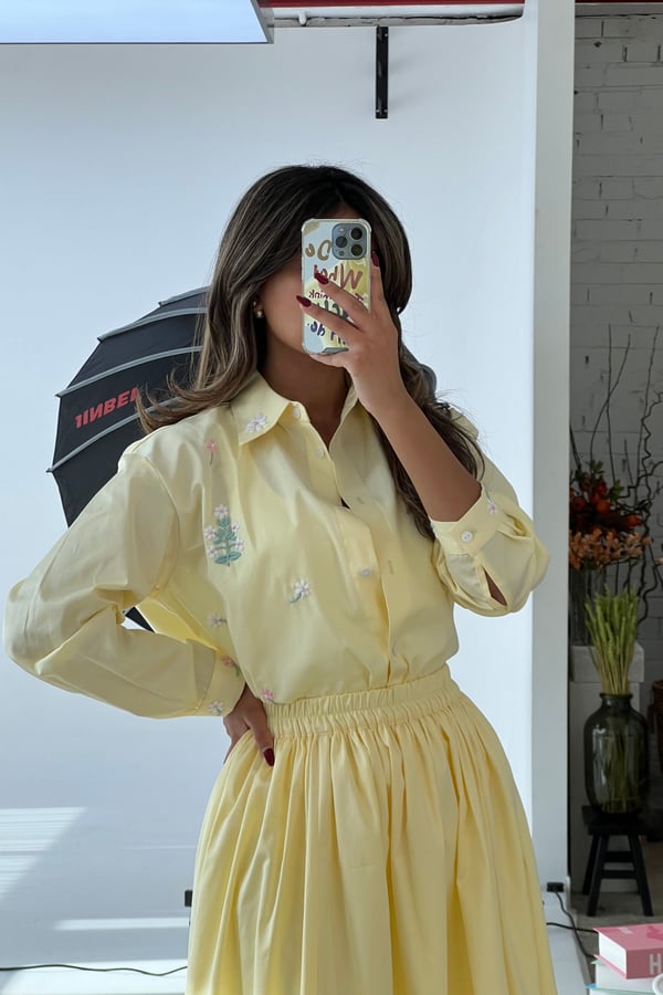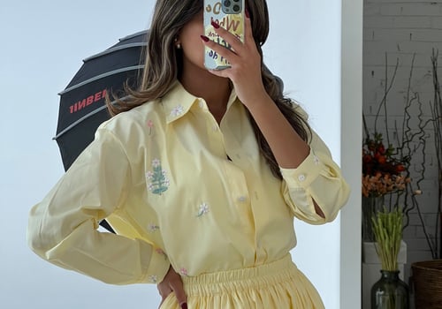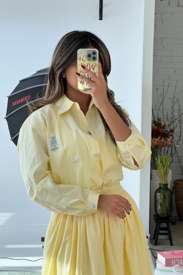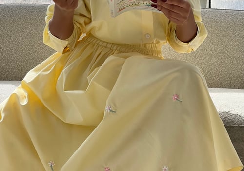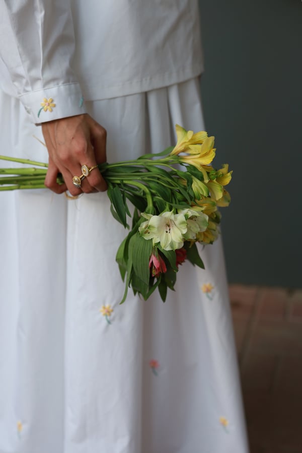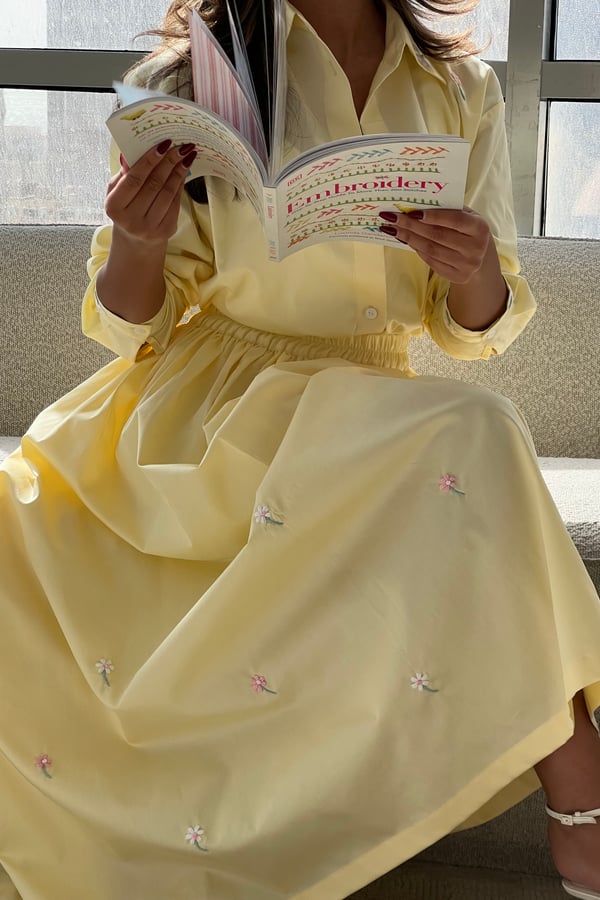 A set adorned with hand-embroidered flowers on soft off-white cotton and butter yellow . Each flower is carefully hand-stitched, making every piece unique. An elegant, comfortable design and a distinctive piece that is never repeated.