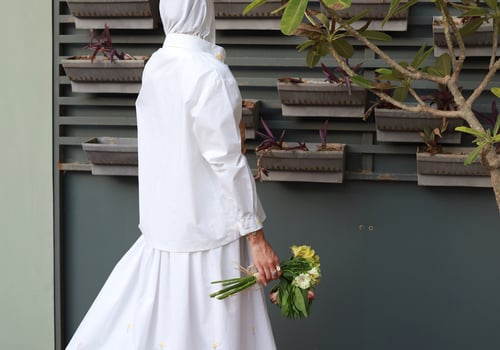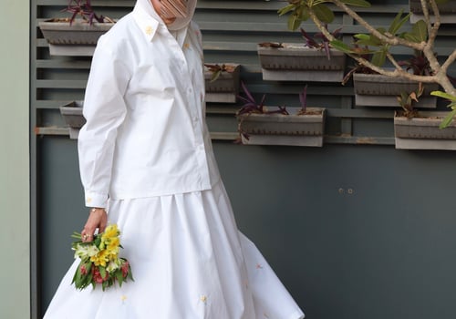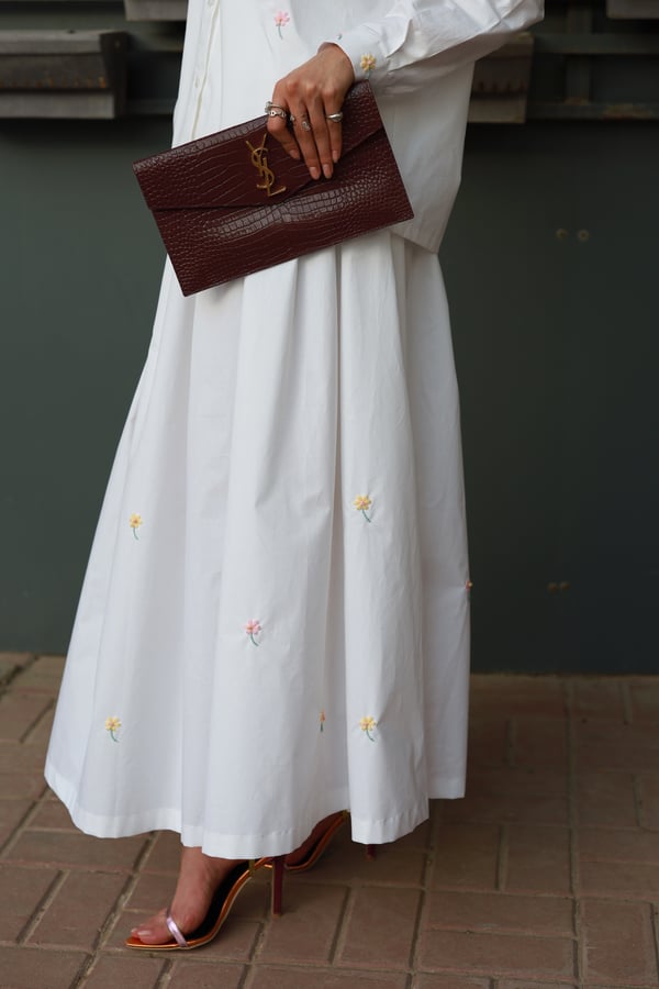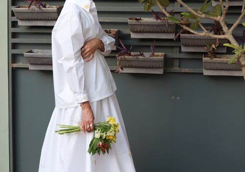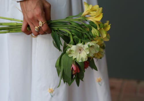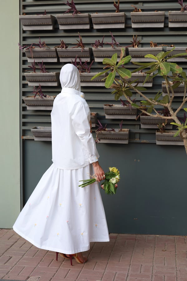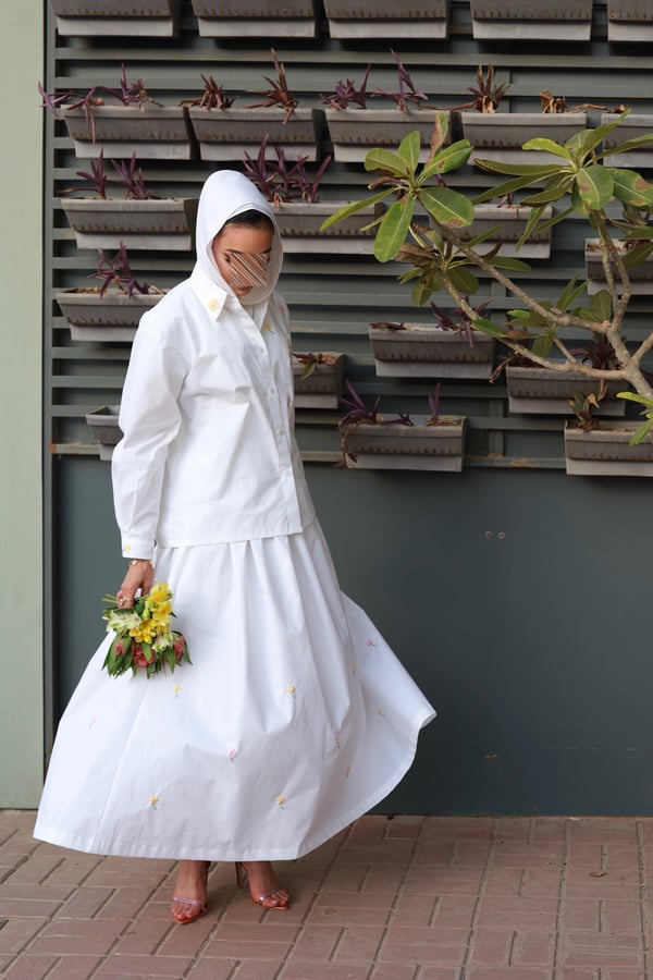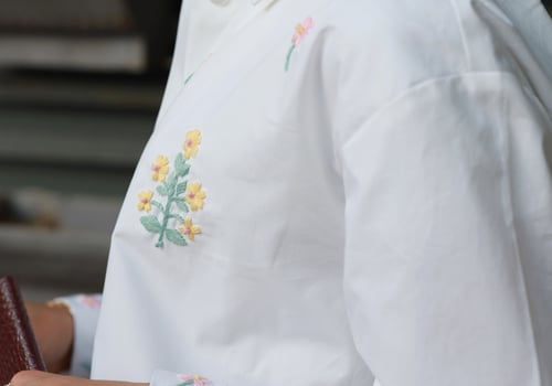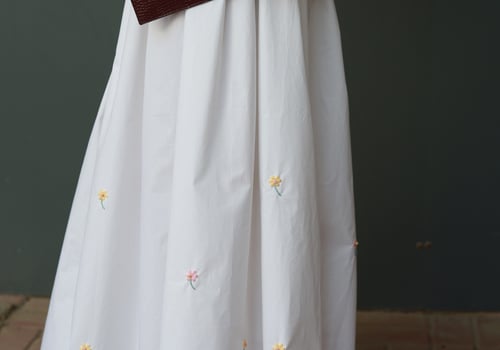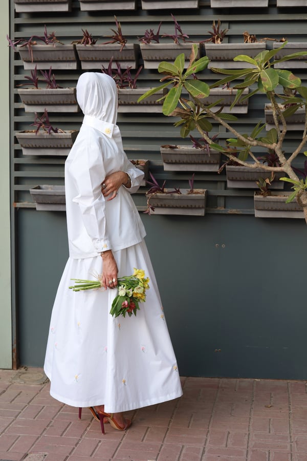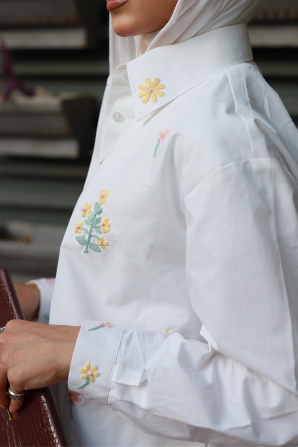 A set adorned with hand-embroidered flowers on soft off-white cotton and butter yellow . Each flower is carefully hand-stitched, making every piece unique. An elegant, comfortable design and a distinctive piece that is never repeated.