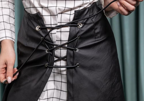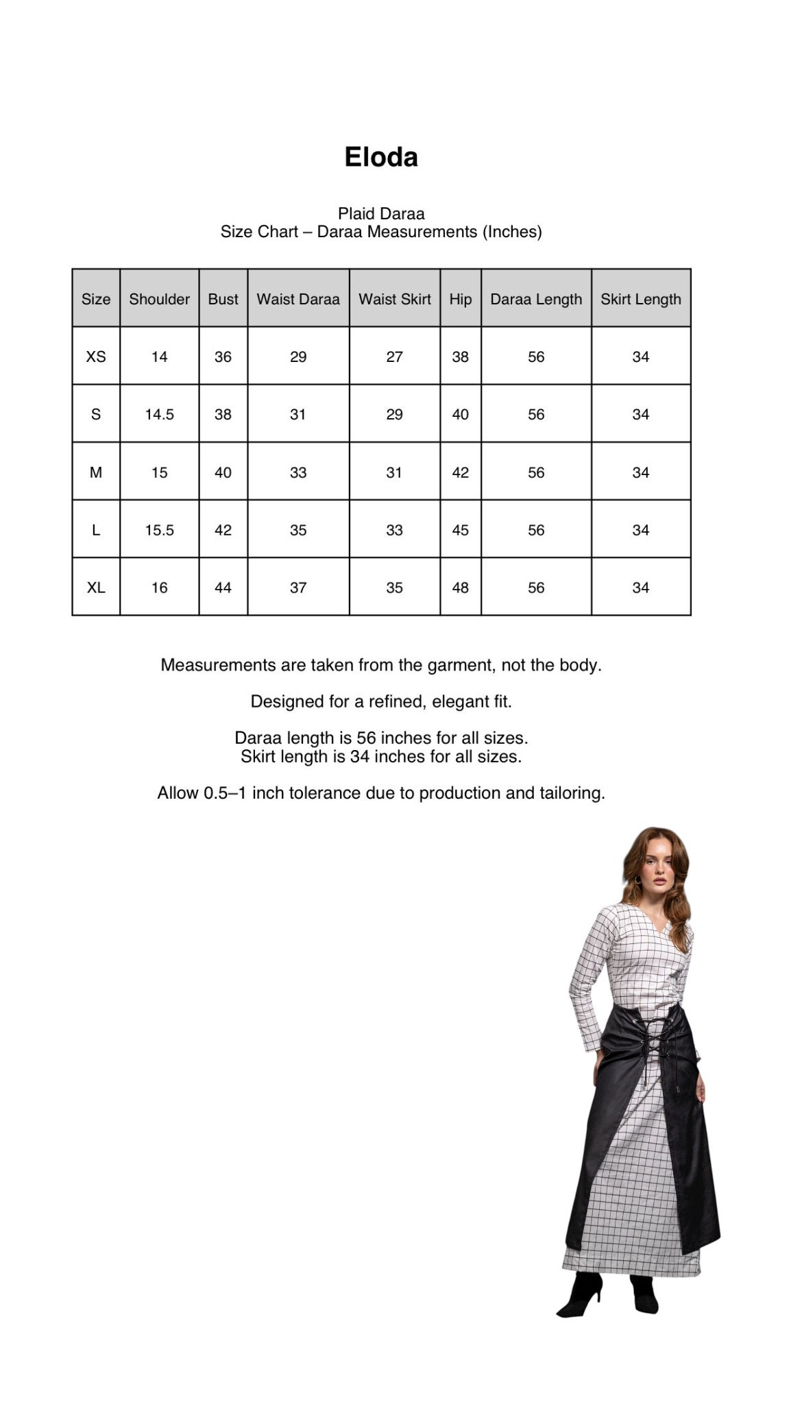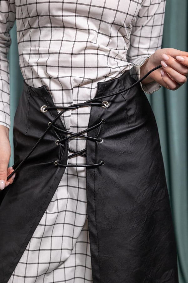 A statement two-piece look featuring a plaid-patterned dress paired with a leather overlay skirt. Designed with a lace-up waist detail that defines the silhouette, blending classic checks with modern edge for an elevated Ramadan style.