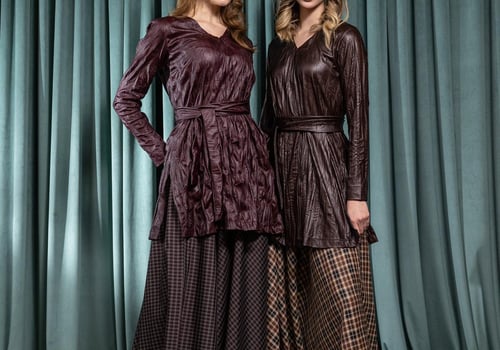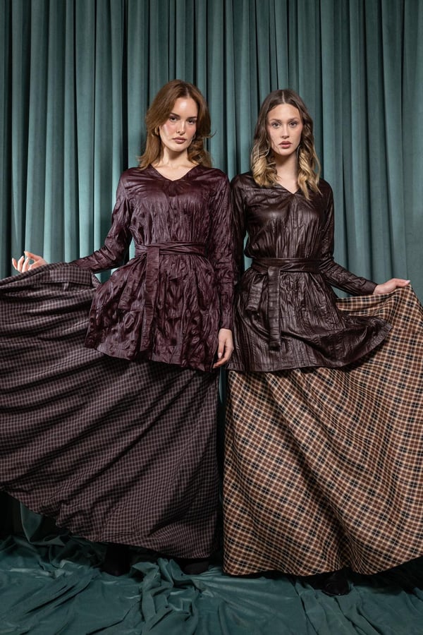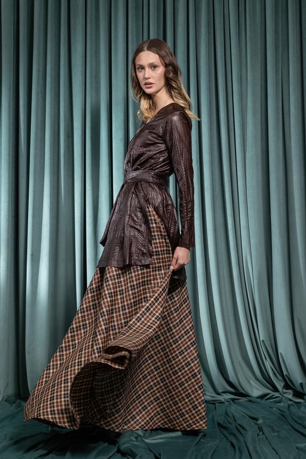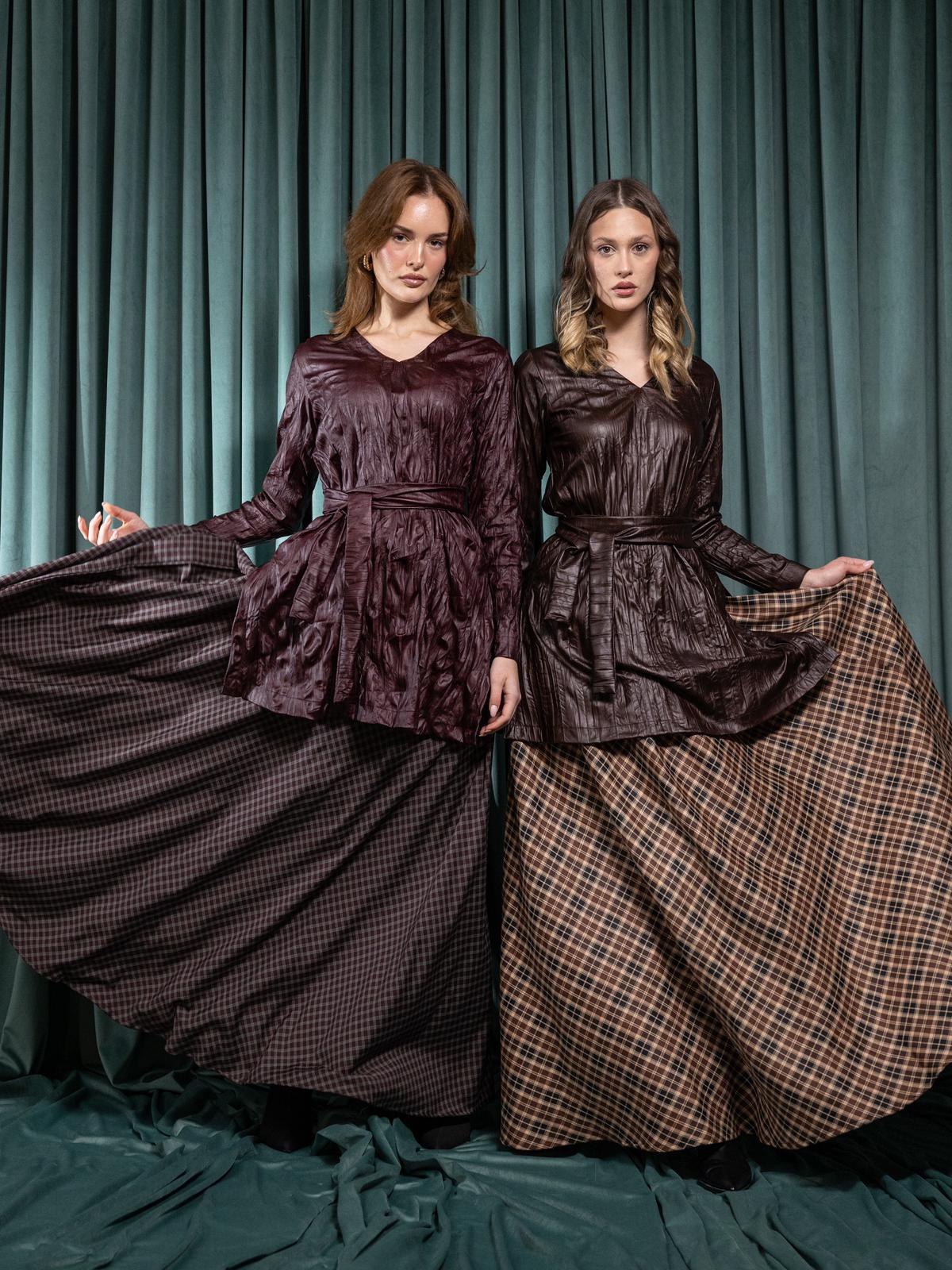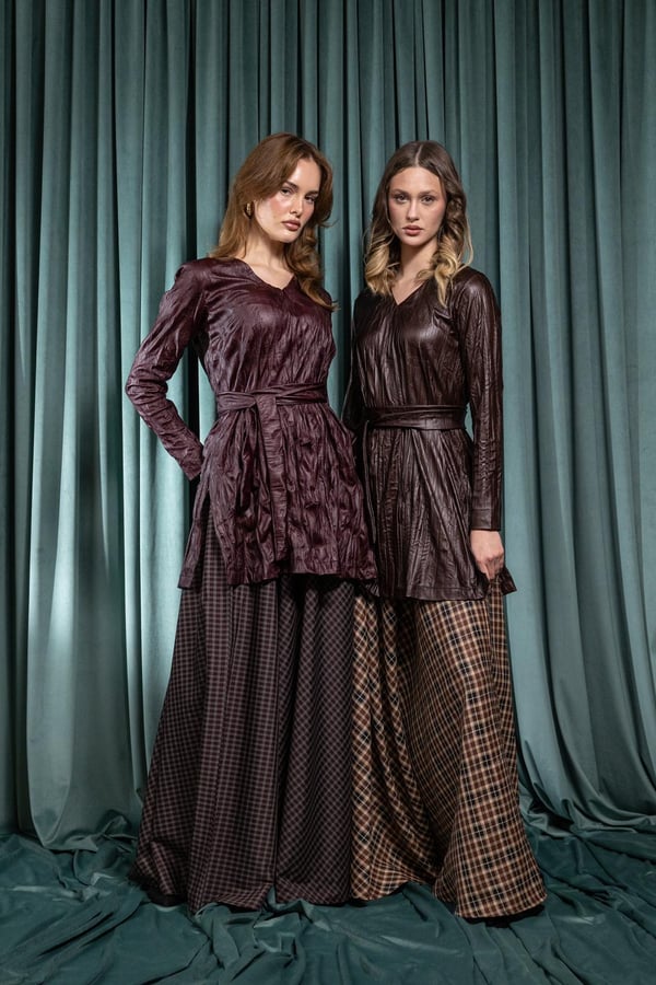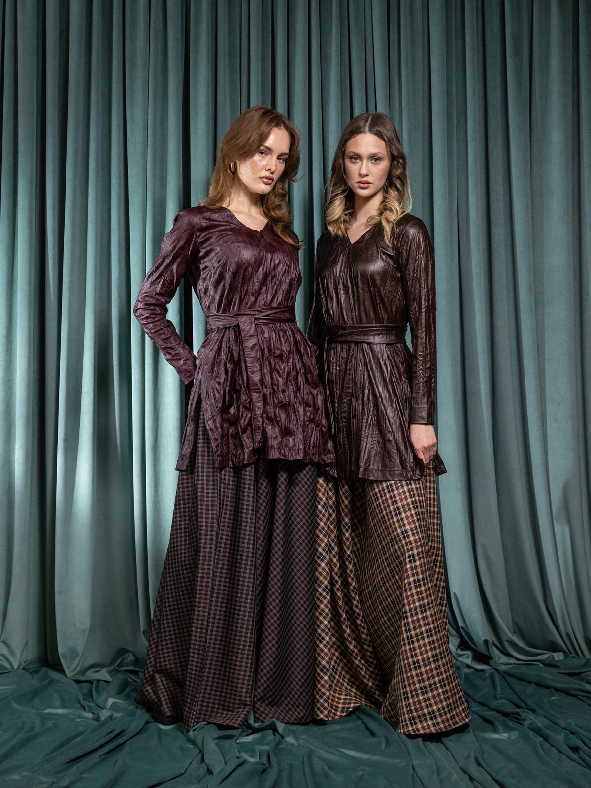 A refined two-piece set featuring a leather top paired with a cotton-linen skirt. Available in two solid colors: brown or burgundy. Designed for an elegant, modern Ramadan look.