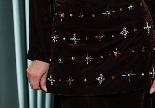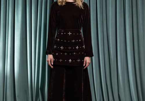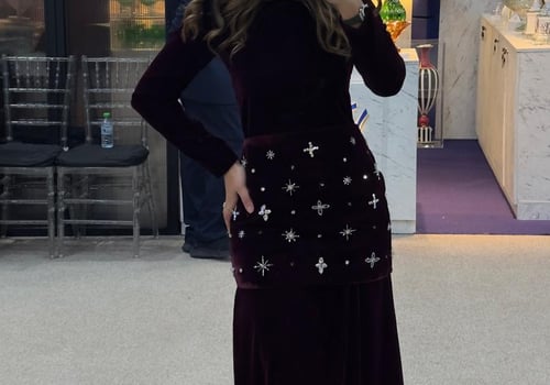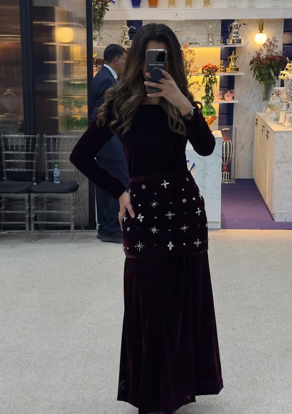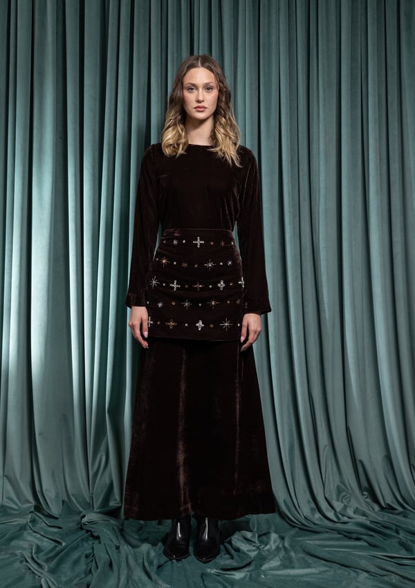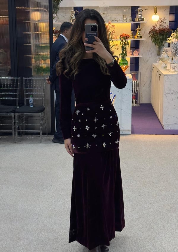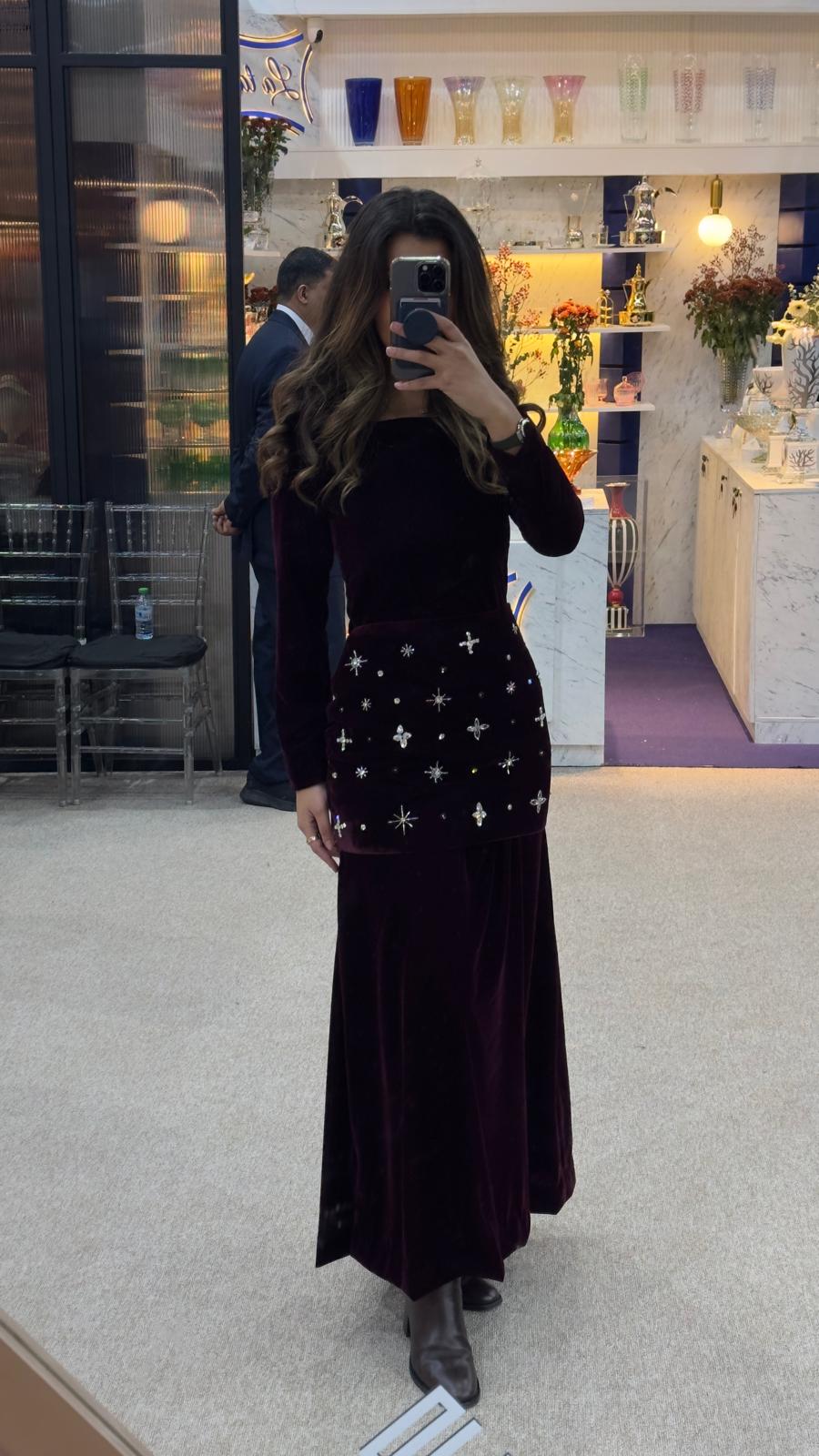 Elegant velvet dress crafted from premium velvet with a comfortable, refined silhouette. Adorned with subtle celestial-inspired symbols and pearl-like details, perfect for Ramadan occasions and elegant evenings.