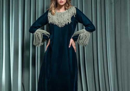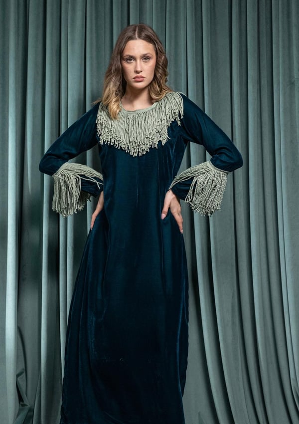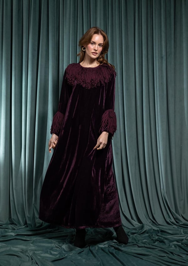 Velvet Fringe is a luxurious velvet dress designed with a straight silhouette and a softly flared hem for elegant movement. Featuring refined fringe details on the chest and sleeves, this piece adds a modern artistic touch—making it perfect for the Ramadan Collection, evening gatherings, and special occasions.